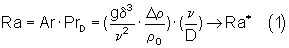 Условия возникновения гравитационной конвекции как в горизонтальных, так и в вертикальных каналах при различной плотности жидкости у стенок определяются при теплообмене [6], [7] критическим значением критерия Релея Ra=Gr·Pr; в рассматриваемом процессе массообмена диффузионным аналогом критерия Ra=Ar·PrD; эти условия возникают, когда критерий Релея достигает критического значения Ra :