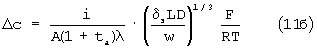 Решение системы уравнений (4)…(7) дает линейное распределение концентраций по высоте каналов в неподвижном электролите и величину разности концентраций у стенок канала высотой (фиг.6):