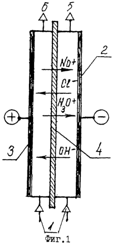 2. Известны способы электрохимической обработки водно-солевых растворов [8], в которых с целью устранения указанных недостатков осуществления процесса в плоскостных каналах обработку раствора проводят пропусканием его в каналах кольцевого сечения в устройствах [9], [10], имеющих цилиндрический катод 2, коаксиальный цилиндрический анод 3 и цилиндрическую разделительную диафрагму 4 (фиг.4).