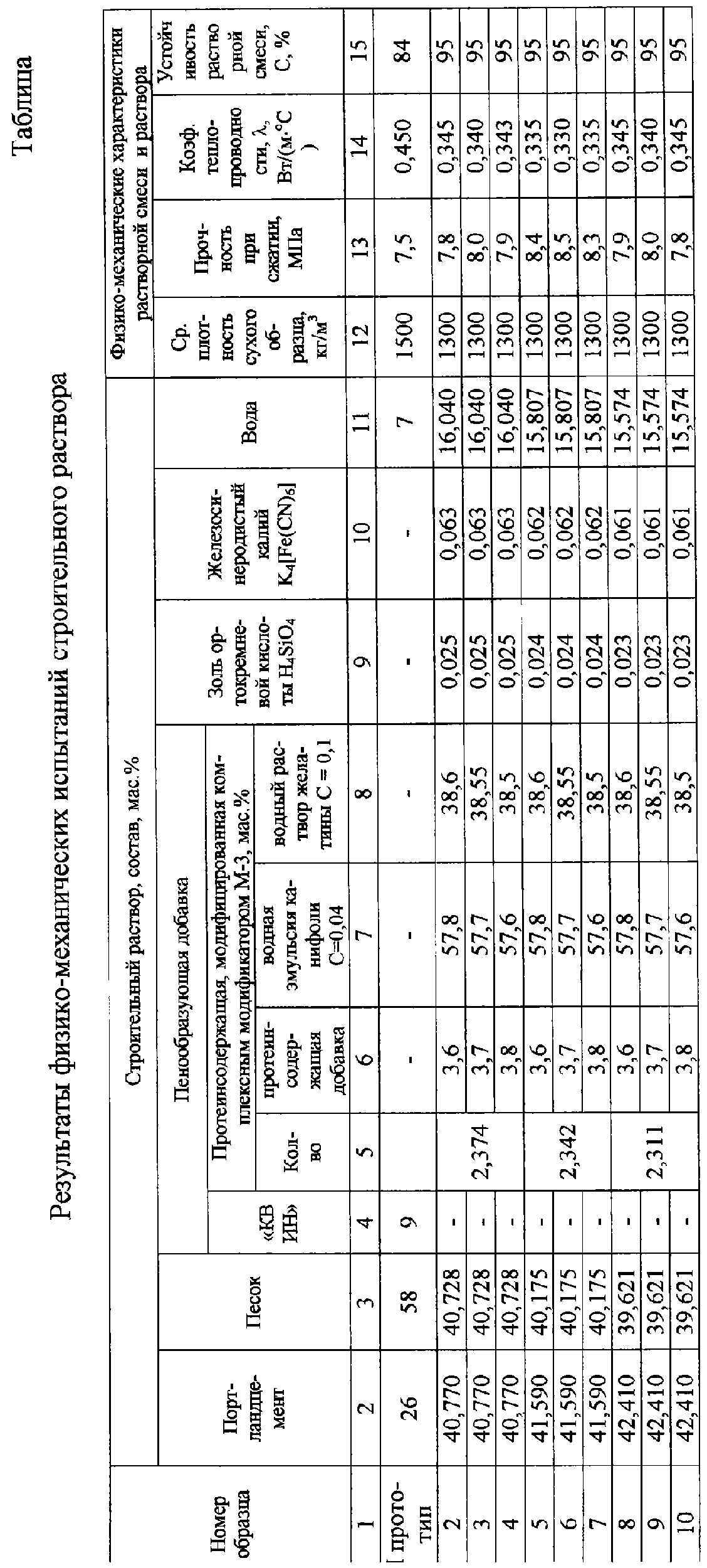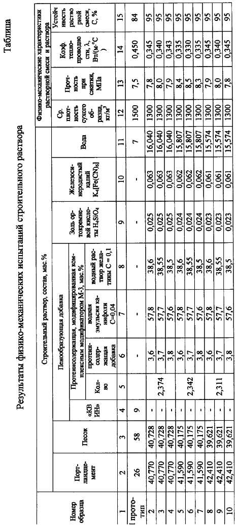 (Патент РФ №2139841; С 04 В 38/10; Бюл. №29 от 20.10.99 г.). Недостатком указанного строительного раствора является повышенная плотность, повышенное значение коэффициента теплопроводности и пониженный коэффициент устойчивости растворной смеси. Задачей изобретения является создание нового строительного раствора, использование которого позволило бы достичь технический результат, состоящий в уменьшении средней плотности раствора, уменьшении коэффициента теплопроводности и увеличении устойчивости строительного раствора. Поставленная задача решается тем, что строительный раствор, включающий портландцемент, песок, пенообразующую добавку, воду, в качестве пенообразующей добавки содержит протеинсодержащую добавку, модифицированную комплексным модификатором М-3, состоящим из водной эмульсии канифоли С=0,04 мас.% и водного раствора желатины С=0,1 мас.% при следующем соотношении компонентов, мас.%: