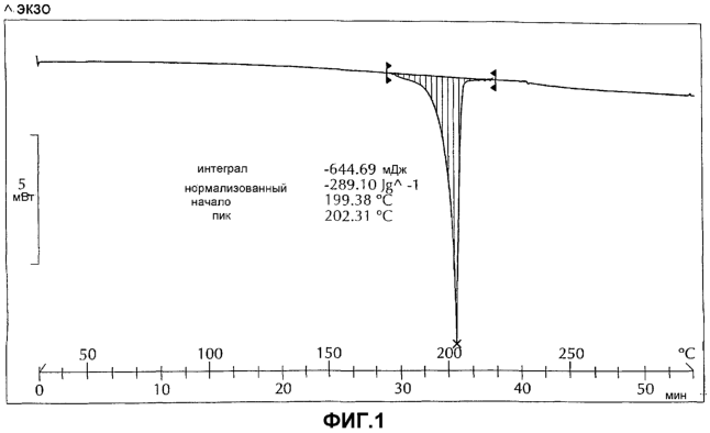 Как видно из фиг.1, цитрат обнаруживает точку плавления около 198-199°С. Специалист в данной области, однако, отметит, что при измерениях методом ДСК существует некоторая степень непостоянства в фактически измеренных начальных и пиковых температурах, зависящая от скорости нагревания, формы и чистоты кристалла и других параметров измерения.
