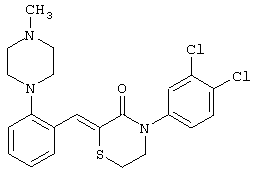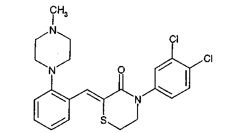 Соединение 4-(3,4-дихлорфенил)-2-[2-(4-метилпиперазин-1-ил)бензилиден]тиоморфолин-3-он является антагонистом рецептора серотонина-1D (5-HT1D) и может использоваться при лечении ряда расстройств, заболеваний и состояний центральной нервной системы. Данное соединение, в частности, может использоваться при лечении гипертензии, всех форм депрессии, депрессии раковых больных, депрессии больных болезнью Паркинсона, депрессии больных, перенесших инфаркт миокарда, субсиндромальной симптоматической депрессии, депрессии у бесплодных женщин, детской психоневрологической депрессии, глубоких депрессивных расстройств, единичных приступов депрессии, рецидивирующей депрессии, детской депрессии, вызванной плохим обращением, послеродовой депрессии, дистимии; мягкой, средней или тяжелой форм депрессии с атипичными признаками, меланхолическими признаками, психотическими признаками, кататоническими признаками или без них; сезонного эмоционального расстройства, старческой депрессии, хронической депрессии; расстройства регуляции при состоянии подавленности или при состоянии тревоги и подавленности; смешанного состояния подавленности и тревоги; расстройства настроения, вызванного каким-либо веществом; и вторичного расстройства настроения, обусловленного общим состоянием, биполярного расстройства, биполярного расстройства в фазе угнетения, расстройства при состоянии общей тревоги, фобий, агорафобии, состояния тревоги при общении, социофобии, простых фобий, расстройства при состоянии разобщенной тревожности, синдрома посттравматического стресса, расстройства при отрешенном сознании личности, преждевременной эякуляции, нарушений акта приема пищи, расстройства, связанного с потреблением алкоголя, нервно-психической анорексии, нейрогенной булимии, тучности, зависимости от химических препаратов и пристрастия к алкоголю, кокаину, героину, фенобарбиталу, никотину, марихуане и бензодиазэпинам; гистаминовой головной боли, мигрени, боли, болезни Альцгеймера, обсессивно-компульсивного расстройства, расстройства панического типа, расстройства панического типа с агорафобией, нарушений памяти, слабоумия, амнезии, и возрастного снижения когнитивной способности (ARCD), болезней Паркинсона, слабоумия при болезни Паркинсона, паркинсонизма, вызванного нейролептиками, поздней дискинезии, эндокринных расстройств, гиперпролактинаемии, вазоспазма, сужения сосудов в церебральной сосудистой сети, мозжечковой атаксии, расстройств желудочно-кишечного тракта, включающих изменения в сократительной способности и секреции, негативных симптомов шизофрении, предменструального синдрома, синдрома фибромиальгии, недержания мочи при напряжении, синдрома Тоуретта, трихотилломании, клептомании, мужской импотенции, рака, мелкоклеточного рака легких, хронической пароксизмальной гемикрании, головной боли, связанной с сосудистыми нарушениями, аутизма, глубокого развивающегося расстройства, без уточнения диагноза (NOS), нарушения Аспергера, избирательного мутизма, хронического моторного или голосового тика, соматизации, бессоницы, перемежающихся скачкообразных расстройств, пиромании, патологического пристрастия к азартным играм, расстройства контроля мотивации, предменструальной дисфории, дефицита внимания при гиперактивности (ADHD) у млекопитающих, 