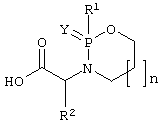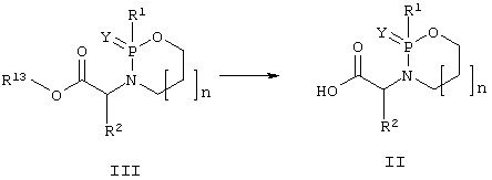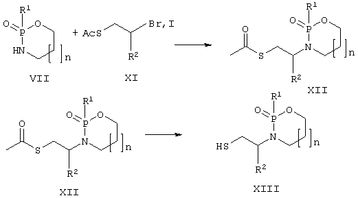 В предшествующей области исследовали простые пептидные соединения, а также линейные и циклические сульфонамидные соединения, например, EP-A-0489577, WO 96/16931, WO 96/33991, WO 97/44315 и WO 00/09485. В патентной публикации предшествующей области существует только один пример, в котором описаны простые линейные фосфинамидные соединения [WO 98/08853]. Эти соединения структурно отличаются от циклических соединений общей формулы (I). В предшествующей области описаны лишь 1,3,2-оксазафосфороциклоалканы с простым фенильным и алкильным заместителями, однако, они не содержали необходимой гидроксамовой кислоты или других групп, связывающих цинк (например, PL 149593, FR 2567129, Izv. Akad. Nauk., Ser. Khim (1995) (11), 2241-9). В настоящее время неожиданно было найдено, что новые соединения на основе 1,3,2-оксазафосфациклоалканов общей формулы (I) настоящего изобретения являются эффективными ММР ингибиторами. Предпочтительные соединения настоящего изобретения проявляют от наномолярной до микромолярной эффективности при ингибировании ММР, таких, как ММР-13, ММР-9 и ММР-3.