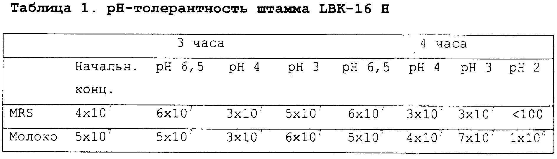 Перед исследованием LBK-16 H дважды культивируют в течение 17-18 часов в MRS-бульоне. После этого штамм культивируют в течение исследования либо в MRS-бульоне, либо в молочном бульоне. В рН-исследовании рН тестируемого бульона (MRS) доводят до рН 6,5, рН 4 и рН 2 (молочной кислотой). Данные бульоны засевают культурами в MRS- или молочном бульоне таким образом, что начальная концентрация составляет 107 колониеобразующих единиц/мл, и культивируют в течение 3 и 4 часов при 37°С, после чего определяют концентрацию штамма LBK-16 Н из культур (способом определения Lackobacilli на MRS-агаре). Результаты представлены в таблице 1.
