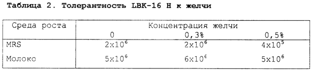 LBK-16 H культивируют как в примере 3, Исследование выполняют в MRS-бульоне, к которому добавляют желчную кислоту. Bile Bovine, Sigma B-3883 в количестве 0,3% и 0,5%. К бульону, содержащему желчь, добавляют 1% свежей культуры из культивирования на основе MRS или молока, начальная концентрация составляет 2-5×106 колониеобразующих единиц/мл. Штамм культивируют в бульоне в течение 3 часов, после чего определяют концентрацию клеток на MRS-агаре. Результаты представлены в таблице 2.