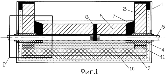 Днище металлического кожуха 1 футеруют тремя рядами теплоизоляционного кирпича, образуя теплоизоляционный слой 9, по периметру кожуха монтируют из огнеупорного кирпича обрамление 11 и образовавшуюся футерованную кирпичом емкость заполняют пылью циклонов газоочистки электротермического производства кремния крупностью не более 1 мм и уплотняют. Затем выкладывают ступенчатый выступ 4 бровки, на уплотненный слой пыли газоочистки от циклонов 10 и на ступенчатый выступ укладывают подовые углеграфитовые блоки 6 таким образом, что на верхней горизонтальной поверхности выступа располагается конец закрепленного в пазу блока 6 токоподводящего стержня 5, а на уплотненном слое пыли газоочистки 10 и на поверхности выступа 4 располагается подовый углеграфитовый блок 6, докладывают бровку 3 и устанавливают на нее боковые углеграфитовые блоки 2, набивают периферийный шов 7 и центральный межблочный шов 8 подовой массой.