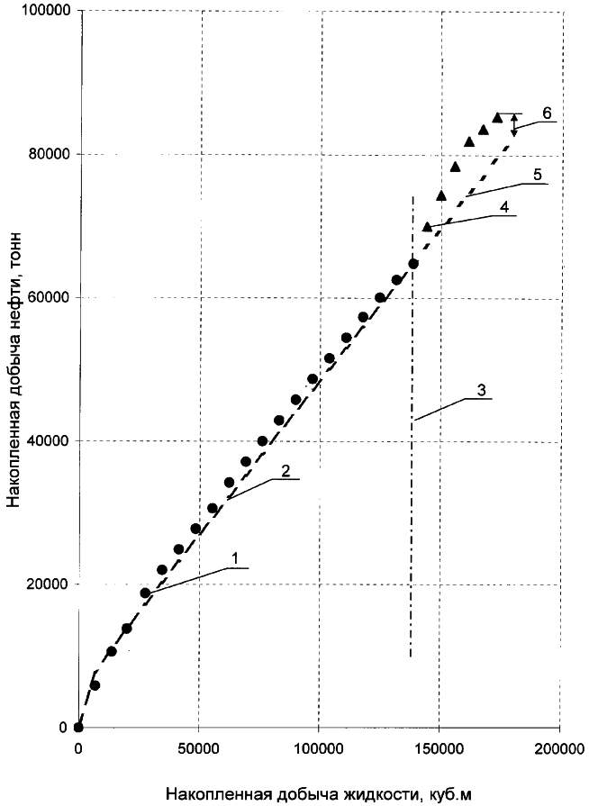 На чертеже представлена оценка технологической эффективности обработки призабойной зоны с помощью технологии по предлагаемому изобретению для конкретной скважины. Эффективность геолого-технических мероприятий оценивается по методу характеристики вытеснения нефти водой (кривой обводнения), то есть по зависимости накопленной добычи нефти от накопленной добычи жидкости. А именно, вначале по фактическим месячным данным о накопленной добыче нефти с начала разработки (круглые точки 1) путем интерполяции была построена (пунктирная линия 2) модель (Леонов В.А. Способ адаптивной оптимизации пластового давления. НПК “Новейшие методы увеличения нефтеотдачи пластов – теория и практика их применения”. Казань, 2001 г.). Эта модель была апробирована авторами на многочисленных промысловых данных многих месторождений. Результаты сравнения предложенной В.А.Леоновым зависимости, аппроксимирующей характеристики вытеснения, с другими известными моделями показали, что она имеет наименьшую погрешность во всем диапазоне обводненностей. После обработки призабойной зоны по предлагаемому изобретению (штрихпунктирная линия 3) были замерены фактические данные по накопленной добыче нефти (треугольники 4) и сделан прогноз базового уровня накопленной добычи нефти (пунктирная линия 5) путем экстраполяции полученной модели – зависимости 2. Как видно из чертежа, за полгода эксплуатации скважины, несмотря на то, что накопленная добыча жидкости снизилась на 7 тыс.м3, но при этом накопленная добыча нефти после обработки призабойной зоны по предлагаемому изобретению увеличилась по сравнению с базовым уровнем на 2,8 тыс.тонн (интервал 6).