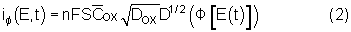 где E(t) – потенциал рабочего электрода, E1/2 – потенциал полуволны деполяризатора, n – число валентных электронов, F – число Фарадея, S – площадь электрода, – исходная концентрация деполяризатора в объеме электролита, Dox – коэффициент диффузии, q=F/RT – величина, обратная температурному потенциалу, R – универсальная газовая постоянная, Т – температура.