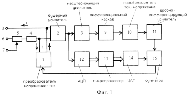 Решаемая техническая задача достигается тем, что в предлагаемое устройство для контроля полярографического прибора, содержащее преобразователь напряжение-ток, выход которого соединен со входом буферного усилителя, с клеммой, соответствующей индикаторному электроду реальной электрохимической ячейки, и постоянным резистором, переменный резистор, первый вывод которого соединен с постоянным резистором, а второй вывод и движок – с клеммами, соответствующими вспомогательному и сравнивающему электродам реальной электрохимической ячейки соответственно, масштабирующий усилитель, вход которого соединен с выходом буферного усилителя, дробно-дифференцирующий усилитель, дополнительно введены дифференциальный каскад, вход которого соединен с выходом масштабирующего усилителя, преобразователь ток-напряжение, вход которого соединен с выходом дифференциального каскада, а выход – с дробно-дифференцирующим усилителем, аналого-цифровой преобразователь (АЦП), вход которого соединен с выходом буферного усилителя, микропроцессор, соединенный с выходом АЦП, и цифроаналоговый преобразователь (ЦАП), вход которого соединен с микропроцессором, а также сумматор, выход которого соединен со входом преобразователя напряжение-ток, а входы – с выходом ЦАП и выходом дробно-дифференцирующего усилителя соответственно.