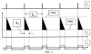 На фиг.3 приведены три временные диаграммы: периодической последовательности синхроимпульсов от ГСИ 20 с периодом следования Ти, определяющим скорость считывания информации об объекте в данной точке, последовательности генерируемых в ГЛЧМ 11 зондирующих импульсов (указанных условно заштрихованными треугольниками по признаку изменяющейся линейно во времени частоты несущих колебаний) с длительностью импульсов