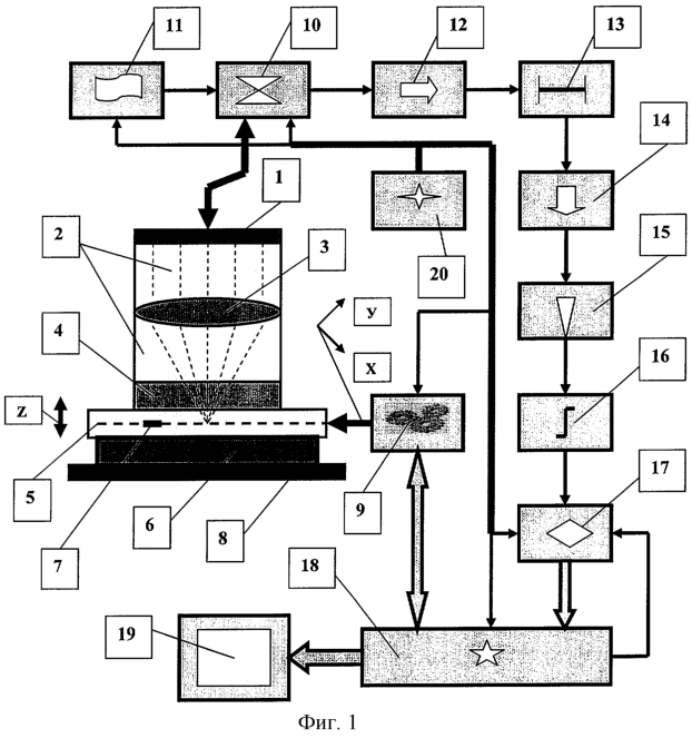 18 – компьютер (с двумя информационными входами и одним выходом, входом синхронизации и двумя выходами управления – к двухкоординатному сканирующему устройству и к временному селектору),