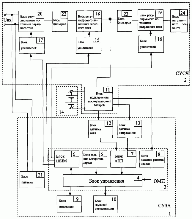 Введение в СУСЧ 2 блока 20 регулируемого источника зарядного тока и блока 17 усилителей позволило вести заряд аккумуляторных батарей с напряжением, превышающим питающее напряжение, и, таким образом, расширить функциональные возможности устройства.