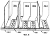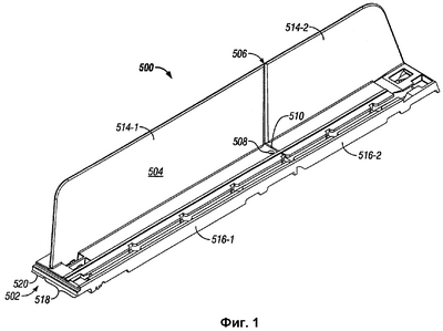 Как видно из фиг.1, Т-образное устройство 500 может по выбору включать линию отрыва, например такую, как линия отрыва 506, и линию отцепления, например линию отцепления 510. Такая комбинация линии отрыва и линии отцепления может быть преимущественно использована для получения одной части для полок, имеющих разную глубину, например 16 дюймов и 10 дюймов. Линия отрыва 506 позволяет отрывать расположенные вертикально детали 514-1 и 514-2 разделителя в качестве первой операции. За этой операцией отрыва может следовать операция отцепления, предназначенная для отделения детали 516-1 дорожки от детали 516-2 дорожки. Сочетание линии отрыва и линии отцепления помогает снимать заднюю часть Т-образного устройства 500. Как будет понятно, расположенная во всю ширину дорожка и/или правый концевой компонент также могут по выбору включать линию отцепления, аналогичную линии отцепления 510.
