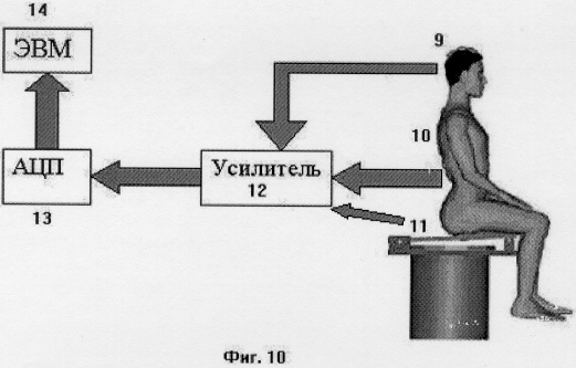 Реализация способа осуществляется следующим образом: пациенту объясняют смысл исследования, после чего его усаживают на подвижную створку устройства 1, находящегося в активированном состоянии, показанном на фиг.8. Неподвижно сидящего пациента «сбрасывают» с определенной безопасной высоты, например 1-2 см, в результате чего, с момента исчезновения реакции опоры, при сохраненном контакте тела с поверхностью, до его восстановления возникает многокомпонентное механическое воздействие на позвоночник. Характер осуществляемого воздействия изображен на фиг.9. После устранения опоры таз с нижней половиной туловища и нижними конечностями, под действием силы тяжести, устремляется вниз, в то время как на голову по-прежнему действует сила инерции покоя, в результате чего позвоночный столб удлиняется подобно пружине – фаза растяжения. Во вторую фазу происходит восстановление силы реакции опоры подвижной створки устройства. В момент контакта подвижной створки устройства, на которой размещен обследуемый, с поверхностью осуществляется дозированное квазистатическое восходящее, механическое воздействие. Энергия воздействия передается по структурам позвоночного столба. Третья фаза связана с тем, что голова и верхняя часть туловища, продолжающая движение под действием силы тяжести, после восстановления веса тела, вызывают сжатие позвоночника во всех отделах, в результате чего его длина становится меньше, чем в состоянии покоя. При этом контакт пациента с поверхностью подвижной створки сохраняется в течение всего времени воздействия, поэтому осуществляемое при помощи предлагаемого способа воздействие во вторую фазу является не ударным, а квазистатическим. В момент восстановления опоры механическое воздействие передается непосредственно на подвижную створку устройства, которое в свою очередь передает его на ветви седалищных костей таза, контактирующих с ней. Воздействие передается на обе седалищные кости единовременно с одинаковой силой, что трудно осуществить каким-либо другим способом. Механические отклики, принимаемые сейсмодатчиками, расположенными на остистых отростках позвонков и костях черепа, фиксируют процессы передачи осуществляемого воздействия по структурам позвоночного столба. Впоследствии осуществляется усиление и анализ сигналов, полученных с датчиков, с последующей обработкой полученных сигналов при помощи аналого-цифрового преобразователя, подключенного к ЭВМ. О биомеханических свойствах позвоночника судят на основании данных, полученных в процессе расшифровки механических откликов по времени появления и их амплитудной характеристике (Фиг. 11-14). Подобные сложные движения позвоночника возникают в процессе ходьбы, поэтому предлагаемый способ наиболее близок к физиологическим нагрузкам. Масса тела человека является «адекватной» нагрузкой для позвоночника, и именно поэтому используется в качестве источника тестового воздействия (Фиг.10). После пробы с собственной массой вес тела доводится до определенной стандартной величины, например 80 кг, в случае, если обследуется взрослое население. При помощи размещения на обследуемом дополнительных грузов в определенных точках туловища, что позволяет проанализировать биомеханические свойства позвоночника в условиях дополнительной нагрузки и, при 