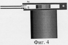 Устройство работает следующим образом: на массивном основании, цилиндрической формы 5, с которой неподвижно соединен жесткий металлический лист 4, являющийся неподвижной створкой, с которым в свою очередь по типу книжки, при помощи шарнира, состыкован второй металлический лист 1, обладающий регулируемой подвижностью во фронтальной плоскости. Между створками 1 и 4 размещен ограничитель подвижности створок 2, неподвижно соединенный с нижней створкой 4. На фиг.2 изображено устройство в собранном виде. Устройство переводится в активное состояние путем взведения подвижной створки 1 на определенную высоту, которая удерживается при помощи сбрасывающего механизма, представляющего собой два магнитных стержня 6, которые подвижно соединены со створками устройства 1 и 4. На фиг.3 изображено устройство в активном виде. На фиг.4 представлен вид устройства после сбрасывания подвижной створки 1. На фиг.5, 6, 7 изображен сбрасывающий механизм. 1 – подвижная створка, 4 – неподвижная створка, 6 – два магнитных стержня, 7 – синхронизатор, 8 – гибкие тяги. Активация устройства производится при помощи перемещения тяг 8, которые вскоре нарушают равновесие состыкованных магнитов 6, в результате чего подвижная створка 1 теряет опору и обрушивается на металлический диск 2, фиг. 4, 7. Положение створок 1 и 4 и сбрасывающего механизма перед активацией изображено на фиг.6. Конечная фаза – фиг. 7. Тяга за нити 8 осуществляется, например, при помощи сердечника, дополнительно установленного электромагнита. После осуществления воздействия подвижная створка 1 вновь взводится на высоту, превосходящую длину магнитов 6, что показано на фиг.5, при этом концы магнитов 6 самопроизвольно и точно состыковываются, и створка 1 осторожно опускается, после чего устройство вновь готово для осуществления воздействия (Фиг.6). Для синхронизации работы устройства и измерительной аппаратуры на определенном расстоянии от магнитных стержней 6 сбрасывающего механизма расположен синхронизатор 7, например геркон, замыкание контактов которого происходит даже при незначительном изменении положения магнитов 6 от вертикали, что служит импульсом для начала записи параметров сейсмодатчиков, расположенных в тестируемых точках на пациенте и запускает регистрацию сигнала на ЭВМ. Характер осуществляемого воздействия контролируется при помощи датчика, который расположен на подвижной створке устройства, механический отклик которого приведен на фиг.9.