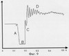 Приводим пример механических откликов, полученных при обследовании взрослого пациента, не имеющего в анамнезе повреждений и заболеваний позвоночника. Началом записи параметров с сейсмодатчиков является сигнал, поступивший с синхронизатора. На Фиг.11 представлен механический отклик с сейсмодатчика, расположенного на теменных костях черепа обследуемого. Механический оклик содержит 3 фазы: фаза А – фаза растяжения, которая характеризует эластоупругие свойства связочного аппарата и составляет 0,07±0,005 с; фаза В – регистрирует механический импульс прошедший по позвоночнику, характеризует механические свойства костных структур, длительность 0,15±0,005 с, амплитуда (Dmax) 25±2 мВ. Фаза С – рефлекторный компонент ответной реакции, время появления 0,08 с, длительность 0,02 с, амплитуда 10±2 мВ.