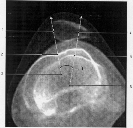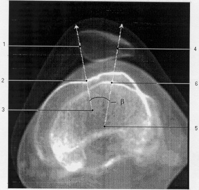 Для определения угла смещения надколенника и его собственной связки относительно ложа надколенника производят компьютерную томографию коленного сустава. По топограмме устанавливают уровни сканирования: проксимально – вверх от надколенника до 1,5 см, дистально – на уровне бугристости большеберцовой кости. После чего с помощью функции Manipulation Average накладывают томограмму на уровне центральных отделов ложа надколенника и томограмму на уровне прикрепления собственной связки надколенника. Затем на созданном изображении производят две прямые линии: