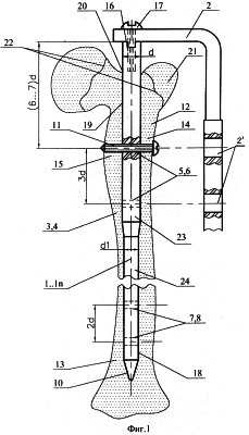 В случае использования штифта постоянного диаметра (см. фиг.2) диаметр (d) штифта задают по диаметру костномозгового канала 18 подростка. При использовании двухступенчатого штифта (см. фиг.1), штифт выбирают таким образом, чтобы диаметру костномозгового канала 18 соответствовал диаметр (d1) ступени меньшего диаметра. В предложенном комплекте этот диаметр d1 составляет 0,8 от диаметра d ступени большего диаметра.