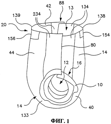На фиг.8 впитывающий элемент 20 одежды по фиг.1 показан в частично разобранном растянутом плоском состоянии, так что показана поверхность, которая обращена к телу пользователя при ношении элемента одежды. В дополнение к образованию отверстий 12 для ног и отверстия 13 для талии (фиг.1) впитывающая основная деталь 14 также образует пару поперечно противоположных боковых краев 136 и пару продольно противоположных краев талии, которые обозначены как передний край 138 талии и задний край 139 талии. Основная деталь 14 также включает, в общем, прямоугольную композитную структуру 133, пару поперечно противоположных передних боковых панелей 134, и пару поперечно противоположных задних боковых панелей 234. Композитная структура 133 и боковые панели 134 и 234 могут быть образованы за одно целое, как показано на фиг.2, или могут включать два или более отдельных элементов, как показано на фиг.1 и 8.