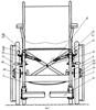 1. Кресло-коляска, содержащее боковые полурамы с колесами, соединенные между собой ножницеобразными трубчатыми элементами и шарнирно соединенные осью, сиденье, съемные подножки с пластмассовой опорой, спинку, подлокотники, отличающееся тем, что снабжено двумя звеньями двутавровой формы, соединяющими между собой две боковые полурамы, двумя передними и задними кронштейнами, установленными на боковых полурамах в местах пересечения передних вертикальных стоек и задних – спинок с верхними горизонтальными поперечинами, четырьмя тягами и четырьмя замками, установленными с одного конца соответственно по две на каждом среднем трубчатом элементе звеньев, на верхних горизонтальных поперечинах по два на каждой и закрепленные между собой с других концов, кронштейнами, расположенными соответственно по три на каждой передней вертикальной стойке, по два на каждой в верхних частях внешней трубы съемных подножек с установленными между ними механизмом их фиксации, амортизатором, большими приводными металлическими велосипедными или пластмассовыми колесами с механизмом быстрого их съема, малыми передними поворотными пластмассовыми колесами.