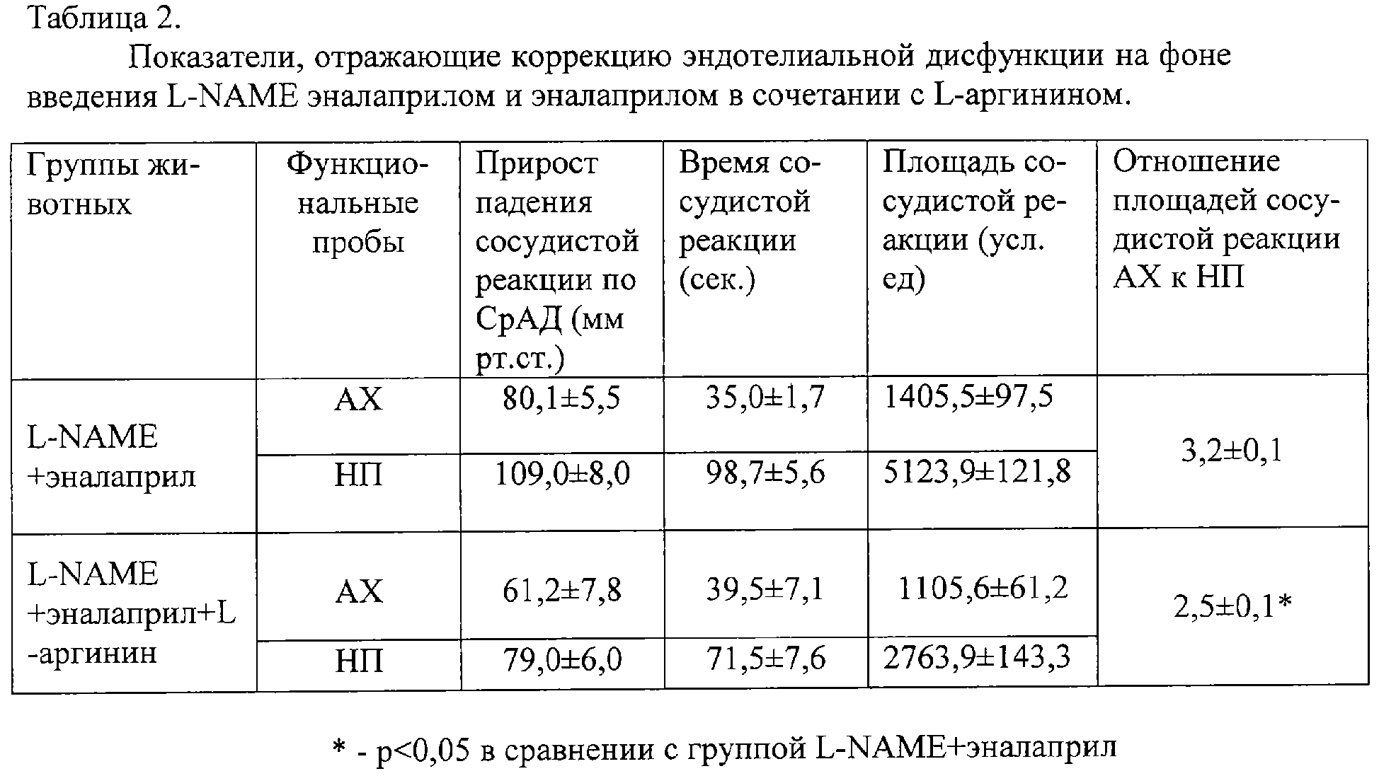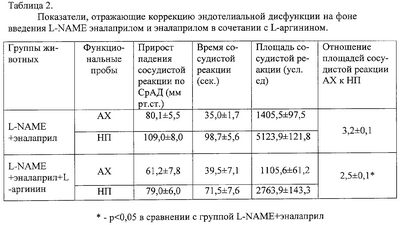 Изобретение относится к медицине, в частности к экспериментальной кардиофармакологии. Основным недостатком способа является узкая патогенетическая направленность и опосредованность действия эналаприла при эндотелиальной дисфункции, связанная с его низкой афинностью (сродством) к тканевой (эндотелиальной) ренинангиотензинальдостероновой системе (РААС), в то время как основная причина развития данного патофизиологического состояния – снижение активности клеток сосудистого эндотелия в образовании оксида азота (NO) – остается некомпенсированной. Поэтому результаты коррекции эндотелиальной дисфункции при недостаточности NO-синтаз с помощью эналаприла неудовлетворительны. Техническим результатом изобретения является способ коррекции эндотелиальной дисфункции, включающий использование эналаприла, относящегося к ингибиторам АПФ, и донатора NO – L-аргинина. Технический результат достигается тем, что на фоне моделирования эндотелиальной дисфункции в эксперименте внутрибрюшинным введением лабораторному животному в течение 7 суток блокатора синтеза NO L-нитро-аргинин-метилового эфира (L-NAME) в дозе 25 мг/кг проводится ее коррекция внутрижелудочным введением эналаприла в дозе 0,5 мг/кг однократно в сутки и внутрибрюшинным введением донатора NO L-аргинина в дозе 200 мг/кг также однократно в сутки, которая приводит к активизации коррекции эндотелиальной дисфункции, так как L-аргинин является основным субстратом для синтеза NO и одновременно активатором его ферментативного пути образования в сосудистом эндотелии. СПОСОБ ОСУЩЕСТВЛЯЕТСЯ СЛЕДУЮЩИМ ОБРАЗОМ Опыты проводят на белых крысах самцах линии Wistar массой 250-300 г. N-нитро-L-аргинин метиловый эфир (L-NAME) вводится внутрибрюшинно в дозе 25 мг/кг/сут. На 7 день от начала эксперимента под наркозом (этаминал-натрия 50 мг/кг) вводят катетер в левую сонную артерию для регистрации показателей артериального давления (АД), болюсное введение фармакологических агентов осуществляют в правую бедренную вену. Показатели гемодинамики: систолическое артериальное давление (САД), диастолическое артериальное давление (ДАЛ) и частоту сердечных сокращений (ЧСС) измеряют непрерывно посредством датчика и компьютерной программы “Bioshell”. Функциональные пробы: эндотелий зависимая вазодилатация (ЭЗВ) – внутривенное введение ацетилхолина (АХ) в дозе 40 мкг/кг, эндотелий независимая вазодилатация (ЭНЗВ) – внутривенное введение нитропруссида натрия (НП) в дозе 30 мкг/кг. При статистической обработке данных рассчитывали среднее значение, величину стандартного отклонения. Различия считали достоверными при р<0,05. ПРИМЕР КОНКРЕТНОГО ВЫПОЛНЕНИЯ. Болюсное внутривенное введение АХ в течение 3-5 сек приводило к резкому падению артериального давления, достигающего пика у интактных животных для систолического давления (САД) 84,3±4,4, для диастолического давления (ДАД) – 38,7±2,8 и для среднего артериального давления (СрАД) 53,9±2,7 мм рт.ст., при этом в течение первых 2-3 сек развивалась резкая брадикардия до 130-150 ударов в минуту. Восстановление АД происходило в среднем за 42,2±0,8 сек после нормализации сердечного ритма. ЭНЗВ также характеризовалась снижением САД до 83,0±3,7, ДАД до 42,1±4,4 и СрАД до 55,7±3,5 мм рт.ст. с последующим полным восстановлением в среднем в течение 45,1±1,0 сек. Блокада NO-синтазы с помощью длительного, ежедневного, в те