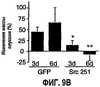 Результаты показывают, что доставка RCAS, содержащего Src 251, к предварительно установившимся медуллобластомам дает в результате селективную вирусную экспрессию в связанных с опухолью кровеносных сосудах (ФИГ.9А), и это, в конечном счете, ведет к регрессии данных опухолей за 6 дней (ФИГ.9В). Важно, что связанные с опухолью кровеносные сосуды у животных, обработанных вирусом, содержащим Src 251, сильно разрушены и количество их меньше по сравнению с сосудами опухолей у контрольных животных (ФИГ.9С). Тот факт, что RCAS-GFP-инфицированные опухоли показывали локализацию GFP только в сосудистой сети опухоли, предполагает, что противоопухолевые эффекты, наблюдаемые при ретровирусной доставке Src 251, обусловлены анти-ангиогенными свойствами.