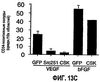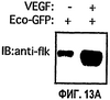Кратко говоря, ангиогенез индуцировали путем подкожной инъекции фактор роста-недостаточного матригеля, содержащего физиологический раствор или VFGF (400 нг/мл) с 2×106 экотропически упакованных клеток, экспрессирующих ретровирус GFP, в бок у бестимусных «голых» (nu/nu) мышей и анализировали через 5 дней инкубации. Новообразование кровеносных сосудов определяли количественно посредством иммуноблоттинга с антителом против рецептора VEGF (flk-1), которое специфично относительно эндотелиальных клеток. На ФИГ.13А изображены результаты иммуноблоттинга. Эффекты киназа-недостаточного Src- 251-, Csk- или GFP-ретровирусов на VFGF- (400 нг/мл) или bFGF-(400 нг/мл)-индуцированный ангиогенез анализировали посредством иммуноблоттинга лизатов тканей с анти-flk-1-антителом. Пример таких результатов представлен на ФИГ.13В. Влияние Src-251- и Csk-экспрессирующих-ретровирусов на VFGF-индуцированное новообразование кровеносных сосудов определяли количественно пересчетом числа CD34-положительных сосудов в поперечных срезах ткани путем непрямой иммунофлуоресценции при троекратном слепом выборе областей с 20х. Криосрезы пробок подвергали также иммунофлуоресцентному окрашиванию анти-СD34-антителом или анти-flk-1-антителом, фотографировали и определяли количественно, как описано выше для исследования ангиогенеза в САМ.