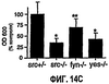 Способность VEGF индуцировать VP сравнивали у мышей src-/-, fyn-/- или yes-/- в исследовании Майлса (ФИГ.14С). Данные для каждого исследования Майлса представлены средним для трех животных значением ± среднеквадратичное отклонение. Дефекты VP у src-/- и yes-/- по сравнению с контрольными животными являлись статистически значимыми (*р<0,05, парный t-тест), тогда как ни дефекты VP у VEGF-обработанных мышей fyn-/-, ни у обработанных аллилизотиоцианатом мышей src+/- не являлись статистически значимыми (**р<0,05).
