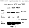 ФИГ.5 иллюстрирует активацию эндогенного Src посредством bFGF или VEGF, как описано в примере 4. Верхняя часть фигуры показывает результаты in vitro исследования киназы с кратной активацией эндогенного c-Src посредством bFGF или VEGF. Нижняя часть фигуры представляет блот исследования киназы с использованием в качестве зонда анти-Src антитела как контроля загрузки на эквивалентное содержание Src и IgG.
