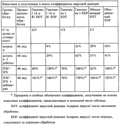 Известные в настоящее время коэффициенты продолжительной вирологической реакции при совместном лечении с использованием комбинации интрон А + ребетол и оценки коэффициентов продолжительной вирологической реакции при монотерапии в течение 48 недель с использованием ПЭГ-IFN- 2А (на основе данных, полученных на фазе II клинических испытаний) и комбинации ПЭГ-IFN- 2А + рибавирин, обобщены ниже в таблице:
