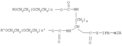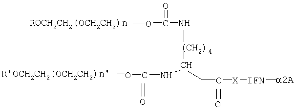 2. Способ лечения хронического гепатита С, предусматривающий введение конъюгата ПЭГ-IFN- в сочетании с рибавирином в количествах, эффективных для лечения хронического гепатита С, где вводимый конъюгат ПЭГ-IFN- представляет собой ПЭГ-IFN- 2А формулы