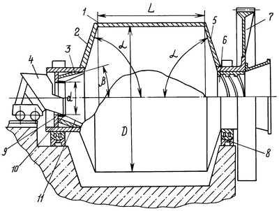 Мельница состоит из цилиндрического барабана 1 длиной L и внутренним диаметром D с конусными торцевыми стенками 2 и 5, на одной из которых размещена цапфа 3 с круговым приемным отверстием диаметром d загрузочного устройства 4, а на противоположной – разгрузочное устройство 6. Мельница установлена на подшипниках 8 и приводится во вращение приводом 7 с электродвигателем. D/L=0,82-0,84; d/D=0,25-0,27. Образующие торцевых стенок 2 и 5 наклонены к продольной оси барабана под углом =75-85°, a образующая цапфы 3 – под углом =13-18°.