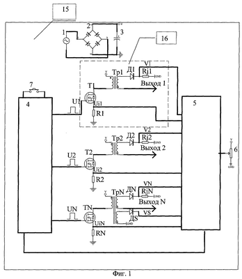Изобретение поясняется фиг.1-5. На фиг.1 приведена схема плазменного модуля, на фиг.2 показана схема соединения выводов модуля для создания N плазменных ячеек, на фиг.3 показана схема создания плазменной панели с непрерывным током за счет объединения катодов секций в модуле. На фиг.4 показана форма тока модуля, на фиг.5 – ток секции. Генератор газоразрядной плазмы включает источник питания, состоящий из источника переменного напряжения 1, выпрямительного моста 2 и конденсатора 3, и состоит из М модулей 15, каждый из которых содержит N одинаковых секций 16, составленных из трансформатора Tpi (i=1,2…N), транзистора Ti (i=1,2…N), выпрямительного диода Di (i=1,2…N), резисторов Ri (i=1,2…N) в первичной и Rji (i=1,2…N) вторичной обмотках трансформаторов. Выходы Выходi (i=1,2…N) вторичных обмоток трансформаторов Tpii (i=1,2…N) подключены к катодам электродов, между которыми зажигается газовый разряд, причем аноды подсоединены к общей шине. N упомянутых секций 16 объединены общей схемой управления, состоящей из схемы обратной связи 5 и распределителя импульсов 4, открывающего поочередно транзисторы Т1-TN в ключевом режиме. Один из трансформаторов, например TpN, секции 16 (TN на Фиг.1) имеет дополнительную обмотку WN, с которой снимается напряжение VS, пропорциональное напряжению на нагрузке, подключенной к выходу ВыходN. Предполагается, что характеристики нагрузок во всех цепях V1-VN каждой секции в модуле одинаковы.