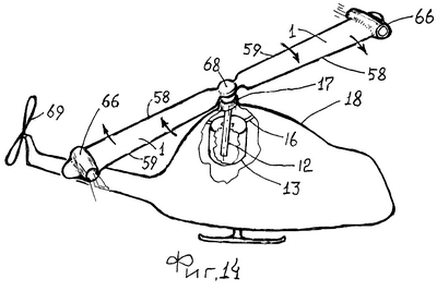 В общем, эжектирующее устройство 66 может быть выполнено не только в корпусе лопастей 1, но и быть подвешено к ним, например, при помощи штатива 67, в котором размещены топливный канал 8 и канал 48 для электропроводов (Фиг.11 и 13).