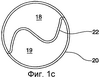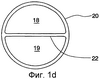 На фиг.1a можно видеть поперечный разрез корпуса, взятый в точке, которая находится на полпути между обжимным швом 25 и распределяющим отверстием 50, например, на линии разреза А-А на фиг.1. Показаны две камеры 18 и 19, разделенные разделителем 22 корпуса. Разделитель 22 корпуса предпочтительно не претерпевает никакого раскручивания от обжимного шва 25 через внутреннюю часть корпуса 20 и в выступ 30. Другими словами, нет необходимости, чтобы разделитель 22 корпуса был изогнутым или имел синусоидально искривленную форму, которая соответствует искривлению разделителя 42 колпачка; разделитель 22 корпуса предпочтительно не “поворачивается” внутри корпуса тюбика. Его функция заключается в разделении корпуса на две камеры и обеспечении однородности распределения, как дополнительно описано ниже.