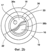 Фиг.2b представляет вид сверху тюбика и выступа, показанных на фиг.2a (с удаленным колпачком). Торцевую поверхность 36 наконечника 34 выступа можно ясно увидеть на фиг.2b. На фиг.2b лицевая поверхность 36 выступа предпочтительно разделена на секции канавкой 33. Лицевая поверхность 36 выступа предпочтительно состоит по меньшей мере из первой секции 36a и второй секции 36b. Лицевая поверхность 36 выступа будет иметь столько секций, сколько камер имеет тюбик. Например, в предпочтительном варианте осуществления, показанном на чертежах, тюбик 20 имеет две камеры 18 и 19; соответственно, торцевая поверхность 36 выступа имеет две секции, первую секцию 36a и вторую секцию 36b. Первая секция 36a торцевой поверхности выступа и вторая секция 36b торцевой поверхности выступа могут быть изготовлены за одно целое элементом из одной детали или могут быть отдельными деталями.