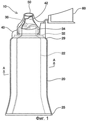 Корпус 20 тюбика представлен обжимным укупорочным средством 25 на конце тюбика, которое располагают напротив распределяющего отверстия 50. Другой конец корпуса 20 тюбика прикрепляют к выступу 30 в связующем или герметизирующем соединении так, чтобы препятствовать просачиванию содержимого тюбика в соединении 29. Колпачок 40 собирают с выступом 30, как подробно описано ниже, так чтобы аналогичным образом препятствовать просачиванию содержимого тюбика.