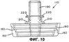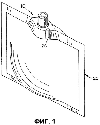 Когда мешок 20 прикреплен к выливному устройству 10 посредством ультразвуковой сварки, которая является предпочтительной, адгезивным или иным способом, то разнесенные области на внутренних стенках участков 22 полотна прикреплены к поверхностям 72, 74, 76, 78 прикрепления на разнесенных заплечиках 62, 64, 66, 68 выливного устройства 10. Известно, что прикрепление вдоль разнесенных областей может быть особенно эффективным; см., например, патент США 6050451, столбец 7, строки 25-28.