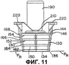Выливное устройство 11 отформовано так, чтобы обеспечить корпус 130 чашеобразной формы, открывающейся вверх, имеющий два противоположных боковых стеночных участка 132, внутренний конец 134 (Фиг.9), который имеет наружную периферию 136 и обращен к внутренней области 124 сжимаемого мешка 120, когда выливное устройство 110 прикреплено к сжимаемому мешку 120, и наружный конец 144 (Фиг.9), который имеет наружную периферию 146. Наружная периферия 136 внутреннего конца 134 выливного устройства 110 образует ссылочную плоскость PR, показанную на Фиг.11. Выливное устройство 110 отформовано так, чтобы обеспечить внутреннюю унитарную трубку 148, которая выступает вниз в корпус 130 при исходном формовании выливного устройства 110, но затем деформируется (посредством процесса, описанного здесь далее) в изогнутую форму, показанную на Фиг.13.