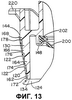 Предпочтительно, как показано на Фиг.13, выливное устройство 110 снабжено внутренним клапаном 200 щелевого типа, который прикреплен к выливному устройству 110 и находится внутри этого устройства. Клапан 200 структурно и функционально подобен клапану 100 и клапанам, описанным в патентах США №5439143 и №6050451, см. выше. Клапан 200 имеет наружный фланец 202. Как указано выше, выливное устройство 110 имеет внутреннюю унитарную трубку 148, которая выступает вниз (в трубчатой форме) при начальном формовании выливного устройства 110. Затем клапан 200 устанавливают в выливное устройство 110. После ультразвуковой сварки или прикрепления иным способом трубку 148 поворачивают под фланцем 202 клапана и вверх так, чтобы зажать фланец 202 клапана в выливном устройстве 110 как только деформированная трубка 148 охладится достаточно, чтобы быть размерно-стабильной.