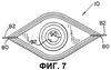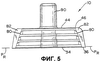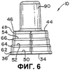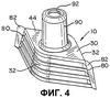 Как показано на Фиг.4, 5, 6 и 7, выливное устройство 10 отформовано из полимерного материала, предпочтительно полиэтилена высокой плотности (HDPE), пригодного для приваривания к участкам 22 полотна сжимаемого мешка 20 ультразвуковой сваркой, которая является предпочтительной, прикрепления адгезивным или иным способом. Выливное устройство 10 отформовано с образованием корпуса 30 чашеобразной формы, открывающейся вниз, который имеет два противоположных боковых стеночных участка 32, как показано на Фиг.4, а также внутренний конец 34 и наружный конец 44, как показано на Фиг.5. Внутренний конец 34, имеющий наружную периферию 36, обращен к внутренней области 24 сжимаемого мешка 20, когда выливное устройство 10 прикреплено к сжимаемому мешку 20. Наружный конец 44 имеет наружную периферию 46. Наружная периферия 36 внутреннего конца 34 выливного устройства 10 образует ссылочную плоскость PR. Выливное устройство 10 отформовано так, чтобы обеспечить внутреннюю унитарную трубку 48, как показано на Фиг.8. Трубка 48 выступает вниз в корпус 30 при исходном формовании выливного устройства 10, а затем деформируется (посредством процесса, описанного здесь далее) в изогнутую форму на Фиг.8.