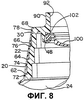 Предпочтительно, как показано на Фиг.8, выливное устройство 10 снабжено внутренним клапаном 100 щелевого типа, который установлен в выливном устройстве 10. Клапан 100 структурно и функционально подобен клапану, описанному в патентах США №5439143 и №6050451, описания которых включены сюда путем ссылки в уместной и целесообразной степени. Клапан 100 выполнен из эластомерного материала, такого как силиконовая резина. Клапан 100 имеет наружный фланец 102. Как отмечено выше, выливное устройство 10 имеет внутреннюю унитарную трубку 48, которая выступает вниз (в трубчатой форме) при исходном формовании выливного устройства 10. Затем клапан 100 устанавливают в выливное устройство 100. После ультразвуковой сварки или прикрепления иным способом трубку 48 поворачивают под фланцем клапана 102 вверх, так чтобы зажать фланец 102 клапана в выливном устройстве 10 как только деформированная трубка 48 охладится достаточно, чтобы быть размерно-стабильной.