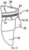 В качестве материала липучки можно использовать любой материал из выпускаемых нидерландской компанией Velcro Industries B.V. под товарным знаком VELCRO®. В качестве эластомерного материала полоски 12 можно применить любой эластичный материал. Рекомендуется использовать для этого какой-либо стандартный эластичный текстильный материал типа тканого или вязаного материала на основе полиэфира/хлопка с прорезиненной или иной эластичной пряжей, например спандекс. Благодаря использованию стандартных эластичных текстильных материалов обеспечивается возможность промывки фиксатора; кроме того, они имеются на рынке с различными цветовыми оттенками, рисунками и в разных сочетаниях. Однако в отдельных особых случаях можно, конечно, пользоваться и другими материалами, например плоскими резиновыми лентами. Полоску 12, как и полоски-липучки 14, 16, можно изготавливать с разной шириной и длиной, в зависимости от размеров контейнера 18, на котором предстоит помещать фиксатор 10, и от требуемой степени регулировки. Совершенно очевидно, что для выполнения фиксатора можно использовать комбинацию полосок из эластомерного материала с полосками из неэластомерного материала, в той мере, в какой допускается их удлинение, достаточное для натяжения фиксатора и его беспрепятственной регулировки.