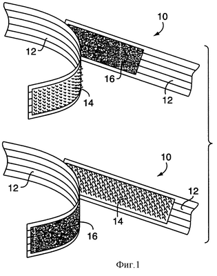 Длина полоски 12 и полосок-липучек 14, 16 выбирается так, чтобы она соответствовала контейнерам с разными поперечными сечениями, для которых используются такие же вкладыши 20, например мешки для мусора емкостью тринадцать галлонов, благодаря чему удается использовать фиксатор 10 для контейнеров любых размеров с вкладываемыми в них мешками данного конкретного размера или емкости. При этом обеспечивается также возможность легкой, не требующей усилий регулировки фиксатора 10 без нарушения натяжения или предварительной регулировки. Для прикрепления фиксатора 10 к контейнеру 18 надо поместить вкладыш 20 в контейнер 18 таким образом, чтобы верхний край 22 вкладыша 20 выходил из отверстия контейнера 18 и перегибался через верхнюю кромку контейнера, свисая рядом с его наружной поверхностью; затем следует обернуть фиксатор 10 вокруг загнутого на контейнере 18 верхнего края 22 вкладыша 20, после чего скрепить друг с другом соответствующие полоски-липучки 14, 16. Эластомерная полоска 12 обеспечивает возможность регулировки растяжением, но возможность регулировки обеспечивается также полосками-липучками 14, 16, поскольку оказывается необходимо, чтобы лишь небольшая зона одной из застегивающихся полосок, то есть стороны с “крючками”, была прикреплена ко второй полоске, то есть к стороне с “петлями”. Кроме того, для достижения скрепления не требуется, чтобы фиксатор 10 был установлен в каком-либо определенном направлении или с какой-либо конкретной стороны, поскольку благодаря механизму фиксации липучек такая необходимость отсутствует. Более того фиксатор 10 может быть даже немного перекручен и будет при этом продолжать выполнять свою функцию, поскольку полоски-липучки 14, 16 расположены на одной линии. Следует, однако, понимать, что для получения надежного соединения на мешке-вкладыше 20 идеальное расположение на одной линии не является необходимым как следует из фиг.2. На фиг.2 видно, что хотя полоска 16 с “петлями” частично отошла и не лежит на одной линии со стороной 14 с “крючками”, получаемого здесь соединения вполне достаточно для закрепления вкладыша 20 в контейнере 18.