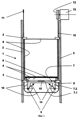На фиг.1 изображено грузоподъемное приспособление согласно изобретению без несущей рамы с важнейшими для его функционирования компонентами лифта. Поз. 2 обозначены две направляющие, по которым посредством башмаков скольжения или роликовых башмаков 3 вертикально перемещается грузоподъемное приспособление. Последнее состоит, в основном, из рамы 4 основания с плитой 5 основания, установленной на ней кабины 6, названных башмаков скольжения или роликовых башмаков 3 и двух канатоведущих шкивов 9, закрепленных на раме 4 основания посредством опорной конструкции 7 через упругие изолирующие элементы 8. Опорная конструкция 7 состоит из работающей на изгиб балки 7.1 и двух суппортов 7.2 канатоведущих шкивов. Виден также тяговый канат 10, который проходит от точки 11 его закрепления вертикально вниз, затем горизонтально из-под канатоведущих шкивов 9 грузоподъемного приспособления 1, после чего вертикально вверх к приводному шкиву 12 приводного двигателя 13 лифта. Не показано здесь дальнейшее прохождение тягового каната 10 от приводного шкива 12 вниз к размещенному на противовесе оборотному шкиву, а оттуда вверх ко второй точке закрепления каната.