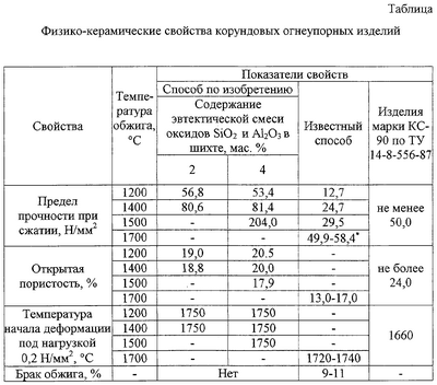Первоначально готовили суспензию указанной тонкомолотой смеси оксидов в водном растворе лигносульфоната технического, которую тщательно перемешивали. Полученной суспензией увлажняли зернистый корунд, после чего вводили тонкомолотую корундовую составляющую и вновь перемешивали. Изделия формовали при давлении прессования 70 Н/мм2, сушили и обжигали при температурах 1200, 1400 и 1500°С. Время выдержки при конечной температуре составляло 6 часов. После обжига производили осмотр изделий с целью выявления брака обжига. В результате осмотра брак обжига по деформациям и трещинам не обнаружен. Физико-керамические свойства корундовых огнеупоров определяли на образцах по существующим ГОСТам и методикам. Показатели свойств приведены в таблице. Из таблицы видно, что изделия, изготовленные по изобретению, обладают достаточно высокой прочностью (более 50 Н/мм2) при температурах 1200, 1400 и 1500°С. Высокая прочность свидетельствует о спекании изделий. Полученные известным способом изделия при тех же температурах обжига имеют низкую прочность (менее 30 Н/мм2), что говорит о недостаточном их спекании и необходимости дальнейшего повышения температуры обжига. Температура начала деформации под нагрузкой у изделий, изготовленных предлагаемым способом, на 10-20°С выше, чем у изделий, полученных по способу-прототипу. Остальные свойства удовлетворяют требованиям ТУ 14-8-556-87*(*Справочник. Огнеупорные изделия, материалы и сырье. – М.: Металлургия, 1990. с.63), предъявляемым к корундовым изделиям аналогичного состава, содержащим не менее 90% Al2О3. Уровень брака снижен на 9-11%. Таким образом, предлагаемый способ позволяет сократить энергозатраты на производство корундовых огнеупоров за счет снижения температуры их обжига на 200-500°С при сохранении требуемого уровня свойств, предъявляемого к корундовым огнеупорам, а также повысить температуру деформации под нагрузкой и исключить брак обжига изделий. *