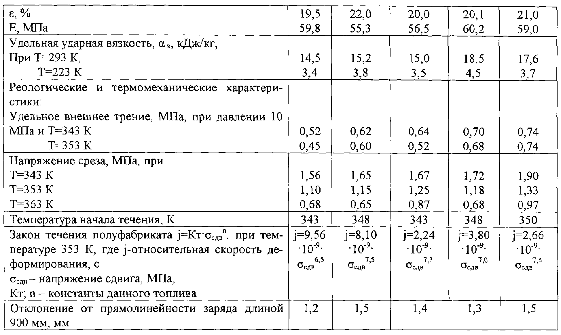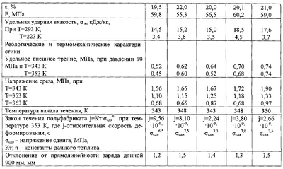 Уровень реологических и термомеханических характеристик предлагаемого топлива обеспечивает возможность промышленного способа производства зарядов из него принятым для отечественных двухосновных топлив высокопроизводительным непрерывным способом.