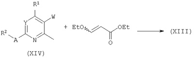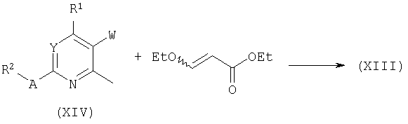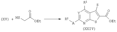 DIPEA (8,71 мл) добавляли к перемешиваемому раствору этил 2-меркаптоацетата (5,15 мл) и 6-хлор-5-циано-4-(3-нитрофенил)-2-фенилпиримидина (пример 31(b), 15,8 г) в смеси EtOH (125 мл) и ДХМ (125 мл) в атмосфере азота. Через 2 часа при комнатной температуре, смесь разбавляли ДХМ до полного растворения, промывали 0,5 н. водн.HCl, сушили (MgSO4) и концентрировали при пониженном давлении.
