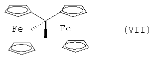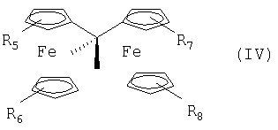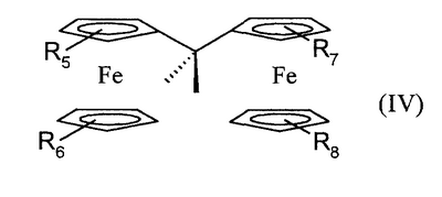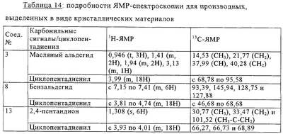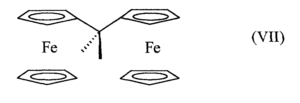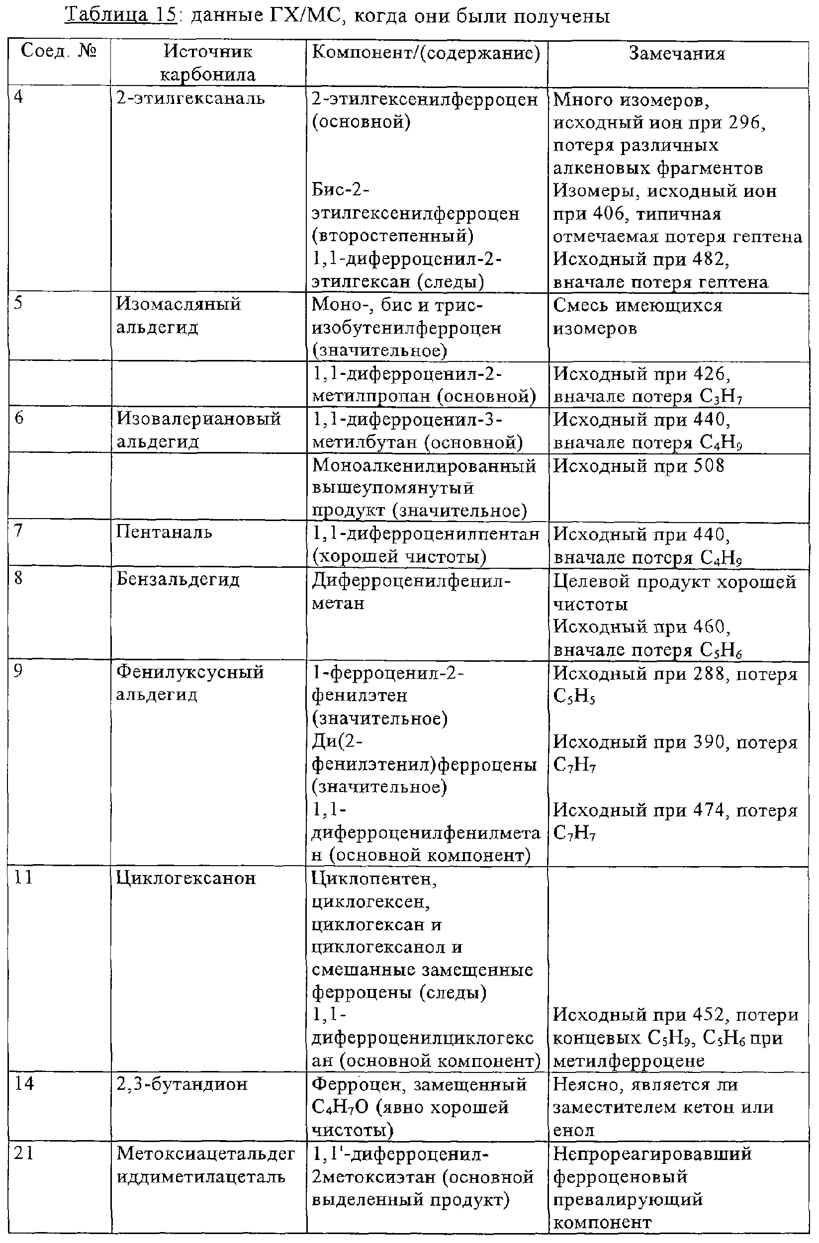 Представленные в приведенной выше таблице значения, рассчитанные для n обозначает 0 и n обозначает 1, относятся соответственно к соединениям формулы I, у которых n в формуле III обозначает 0 или 1. Номер 1а относится к фракции более низкой чистоты, выделенной из смеси после реакции конденсации 0,6 экв. ацетона с ферроценом. По интегральной интенсивности протонов метильной группы в 1Н-ЯМР-спектральном анализе относительно циклопентадиенильных протонов полагали, что если допустить наличие только материалов, у которых n обозначает 0 и n обозначает 1, то в результате содержалось примерно 9 мольных % материала, у которого n обозначает 1. Примечания: соединения с 1 по 15 готовили с использованием ферроцена; 1соединения готовили с использованием диметилферроцена, вследствие чего в формулах II и III как А, так и В обозначает метилциклопентадиенильные группы; 2соединения готовили с использованием этилферроцена, вследствие чего один из А и В в формуле II и в формуле III обозначает этилциклопентадиенил, а другой в каждом случае обозначает циклопентадиенил.