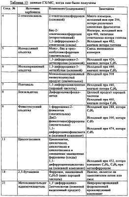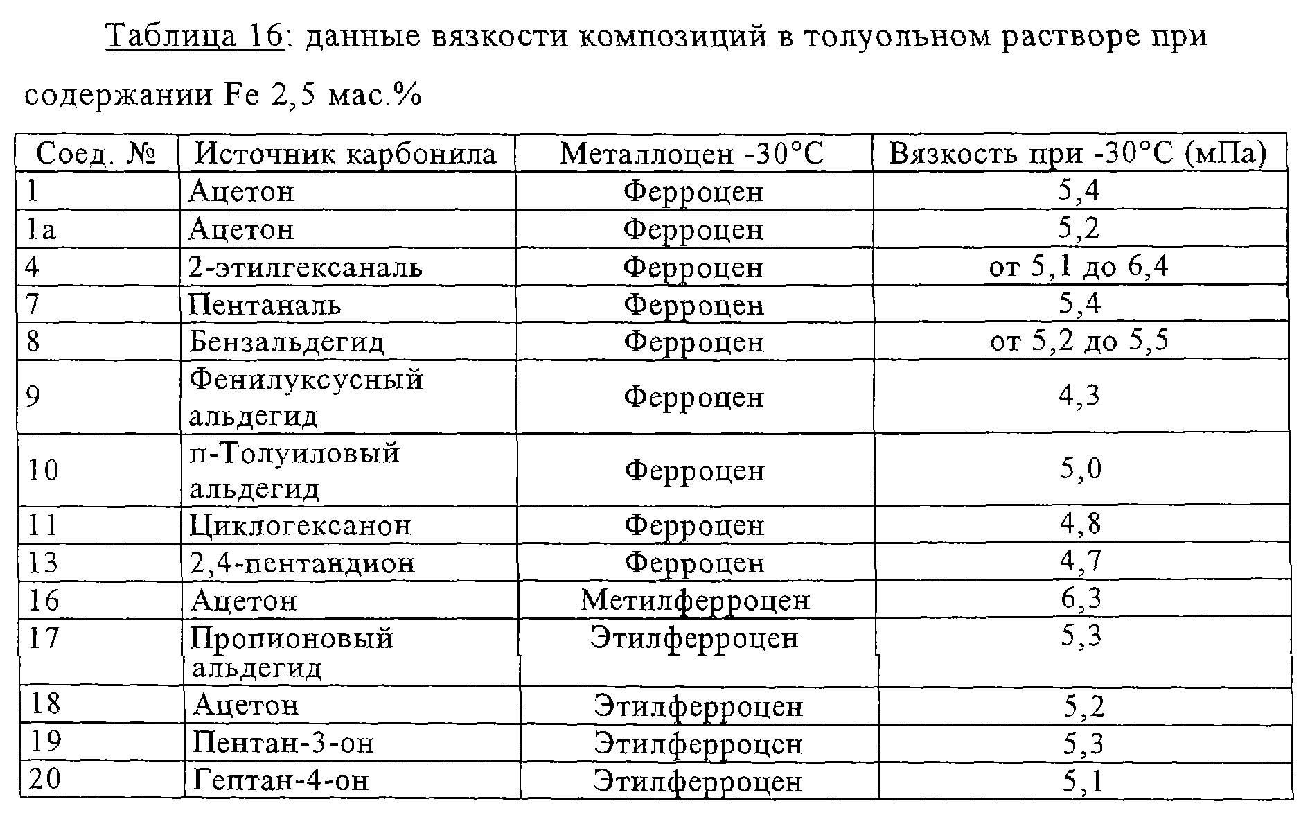 См, пояснительные примечания под таблицей 11. Для сравнения растворимость железа в виде ферроцена в толуоле составляла примерно 1 мас.%. Степень разбавления образцов с 5 мас.% железа в виде продукта соединения 1 обуславливала предел растворимости этого предпочтительного материала в толуоле при -30°С несколько меньше 3,2 мас.%. Интерпретация данных Вышеприведенные соединения 1 и 1а готовили для получения сравнительных данных о растворимости предпочтительного соединения в толуоле. Для проведения таких экспериментов толуол предпочтительнее продукта PLUTOsol Пример соединения 2 показывает, что вместо кетонов могут быть использованы эквиваленты альдегидов, такие как ацетали. Несмотря на то, что продукт, диферроценилметан, проявлял при -30°С более низкую растворимость железа в толуоле, чем любое другое производное, его растворимость все-таки превосходила растворимость собственно ферроцена. Примеры соединений 3 и 7 показывают, что для получения очень чистых образцов 1,1-диферроценил-н-алканов могут быть использованы н-альдегиды. Примеры соединений 4, 5 и 6 показывают, что для получения 1,1-диферроценилалканов можно также применять разветвленные альдегиды. Данные ГХ/МС для соединений 4 (в особенности) и 5 также показывают, что когда альдегид и, как следствие, кетон оказываются разветвленными в Пример соединения 8 показывает, что мостиковая группа может может быть замещена арильной группой, пример соединения 9 – что заместителем может быть аралкильная группа, а в соединении 10 – алкарильная группа. Пример соединения 9 также показывает, что в обычно создаваемых условиях Пример соединения 11 показывает, что мостиковая группа может составлять часть циклоалифатической группы. Соединения с 12 по 15 являются соединениями для дикарбонильных соединений. Полагают, что они образуют продукты формулы I, у которых n в формуле III обозначает ноль, а группа Z замещена двумя группами формулы V, в которой m обозначает ноль. Если такие соединения не получают с исключительно высокой степенью чистоты и/или они не являются легко кристаллизованными, трудно продемонстрировать, что такие продукты действительно образовались. Формульная масса материалов, которой, как полагают, обладает, например, соединение 13, составляет 808 Да. От такого материала не ожидают обладания сочетанием летучести и термостойкости для анализа ГХ, и он характеризуется запредельной массой для применяемого масс-спектрометра. Во всех четырех случаях следы ГХ/МС могли бы привести к заключению о наличии побочных продуктов, включавших алкил-, алкенил-, циклоалкил- и циклоалкенилзамещенные ферроцены и некоторые диферроценовые продукты. Неясно, что они образовывались во время синтеза или пиролиза в ГХ печи. 1H- и 13С-спектроскопические анализы кристаллических твердых веществ, выделенных во время изучения низкотемпературной растворимости на соединении 13, показывают, что имелись или образовались существенные количества высоко симметрического материала, включавшего эквивалентные метильные и циклопентадиенильные группы и, по смыслу, отсутствовали какие-либо карбонильные или гидроксильные группы. Неясно, отсутствовали ли метиленовые протоны или (более вероятно) случайно перекрывались циклопентадиенильными протонами. Пример соединения 16 показывает, что реакционные условия могут быть использованы 